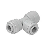 Biała złączka DMfit ATU040404W typu trójnik wyposażony w 3 szybkozłączki 1/4 cala. Trójniki tego typu najczęściej spotykane są w systemach odwróconej osmozy ale również w innych filtrach kuchennych.
