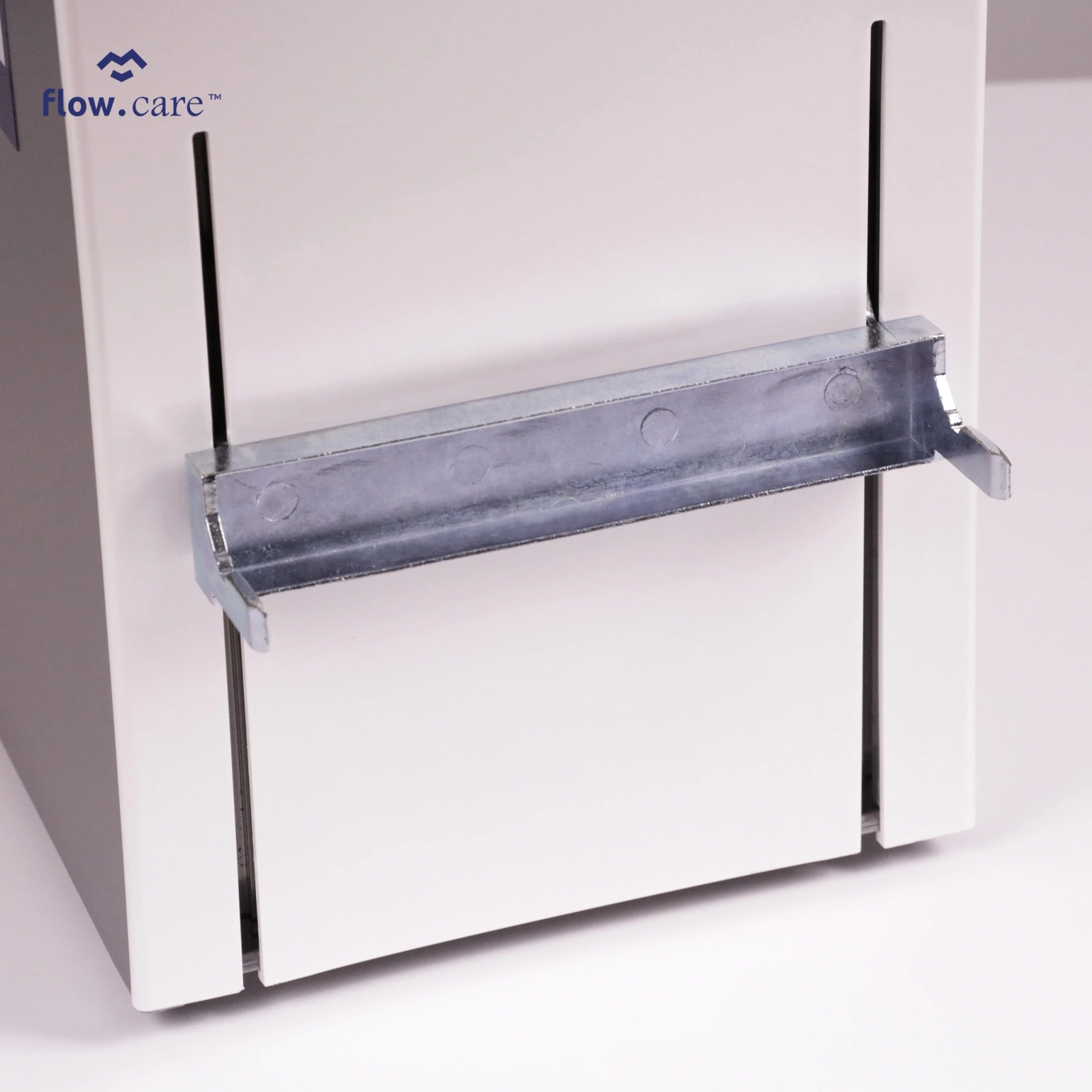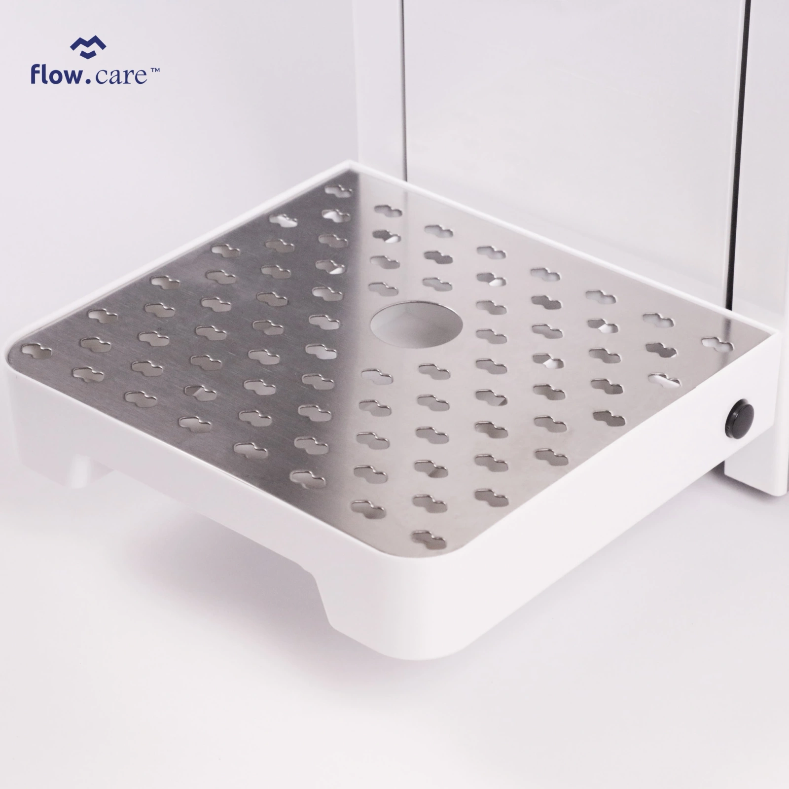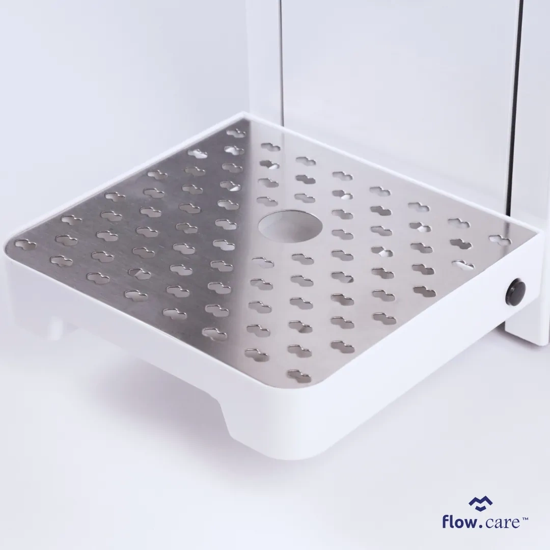 Stałe podłączenie do instalacji wodnej eliminuje konieczność częstego, ręcznego uzupełniania zbiornika, co znacząco upraszcza obsługę i zapewnia niemal nieprzerwany dostęp do wody. Obudowa wykonana ze stali nierdzewnej w eleganckim białym kolorze łączy trwałość z łatwością utrzymania czystości, która jest bardzo ważna w sektorze HoReCa. Praktyczna, ruchoma tacka ociekowa umożliwia dopasowanie wysokości do napełnianego pojemnika, co ogranicza rozchlapywanie wody i ułatwia utrzymanie porządku w pobliżu urządzenia. Tacę w prosty i szybki sposób można odpiąć i opróżnić, gdy zajdzie taka konieczność.